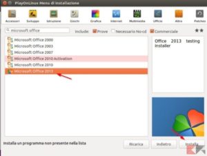 Saranno disponibili varie versioni di Microsoft Office; selezioniamo per i nostri scopi Microsoft Office 2013 e clicchiamo sul tasto Installa per iniziare la procedura guidata per l’installazione della suite d’ufficio.