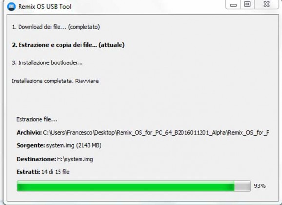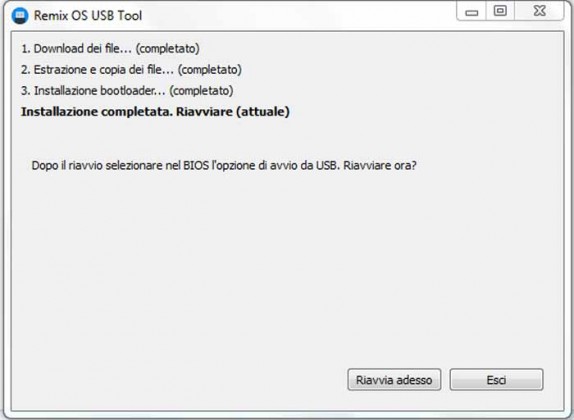 Al termine, ci verrà richiesto di riavviare il PC per avviare Remix OS da chiavetta USB. Ovviamente non è fondamentale per ultimare l’installazione, quindi potete anche uscire e riavviare in un secondo momento.