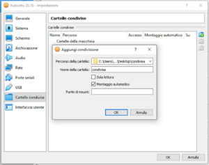 Altra comoda funzionalità offerta da VirtualBox, è la possibilità di impostare una cartella condivisa tra Windows e Linux. Dalla scheda cartelle condivise delle impostazioni della macchina virtuale, selezionate il percorso alla cartella che volete rendere accessibile anche da Linux e spuntate la voce montaggio automatico. Al prossimo riavvio della macchina virtuale la cartella dovrebbe apparire come un’unità di rete.