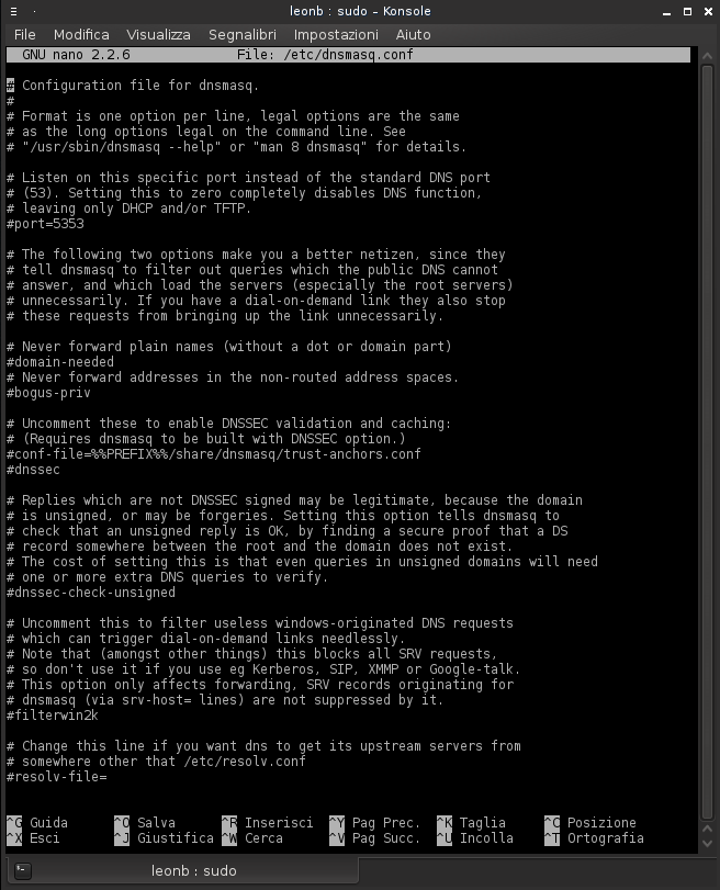 Per poter configurare il programma, tutto quello che è sufficiente fare è andare a modificare il file dnsmasq.conf che trovare all’interno della cartella /etc. Qui vi mostro come farlo utilizzando il terminale e l’editor di testo nano. Il comando che ho utilizzato è: