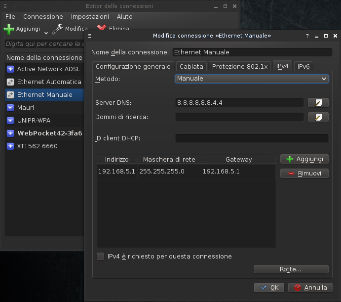 In questo passaggio vediamo come inserire un profilo di connessione attivabile manualmente in modo da poter sfruttare il meccanismo definito prima solo quando è effettivamente necessario. Se per esempio ci stessimo connettendo via ethernet ad un router, dovrebbe fornire lui un indirizzo al nostro computer e non il contrario, quindi abbiamo bisogno di poter scegliere il profilo di connessione da utilizzare. Ho cercato diverse volte di effettuare questa procedura utilizzando il terminale per fornire una guida il più generale possibile, ma ahimè utilizzando l’interfaccia testuale ho sempre fallito ed il profilo di connessione non veniva riconosciuto. Ho dovuto ripiegare sulle funzionalità del mio desktop environment per compiere questa operazione. Spero possa essere di consolazione il fatto che questo passaggio è stato testato da me ed i miei colleghi su KDE 4 (che vedrete qui), GNOME 3, Cinnamon e Unity ed in tutti i casi le finestre erano pressoché identiche ed ha sempre funzionato tutto. Per impostare la nostra connessione manuale dobbiamo: