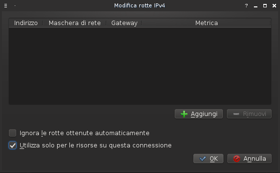 Come ultimo passaggio cliccate sul pulsante “Rotte” che vedete in basso (in altri desktop environment è stato tradotto come “instradamenti“, in inglese sarebbe “routes” o “routing“) e mettete la spunta su “utilizza solo per le risorse su questa connessione“: