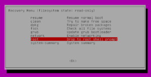 Passo 4: Dal Recovery Menu, date ↓ per selezionare l’opzione root (Drop to root shell prompt)dopo date Enter (potrebbe essere necessario dare Enter due volte):
