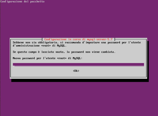 Durante l’installazione dobbiamo fornire una password per l’amministrazione di MySQL (ovviamente è importantissima, ci servirà anche per l’accesso tramite phpmyadmin e per la prima gestione del web server).