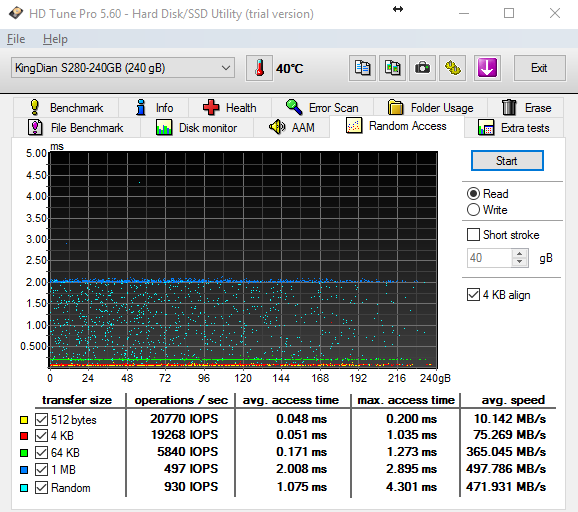 Passando alle IOPS, i valori sono leggermente sotto le specifiche dichiarate e si aggirano sui 65/70 mila, comunque ottimi, così come i tempi di accesso, casuali e non.