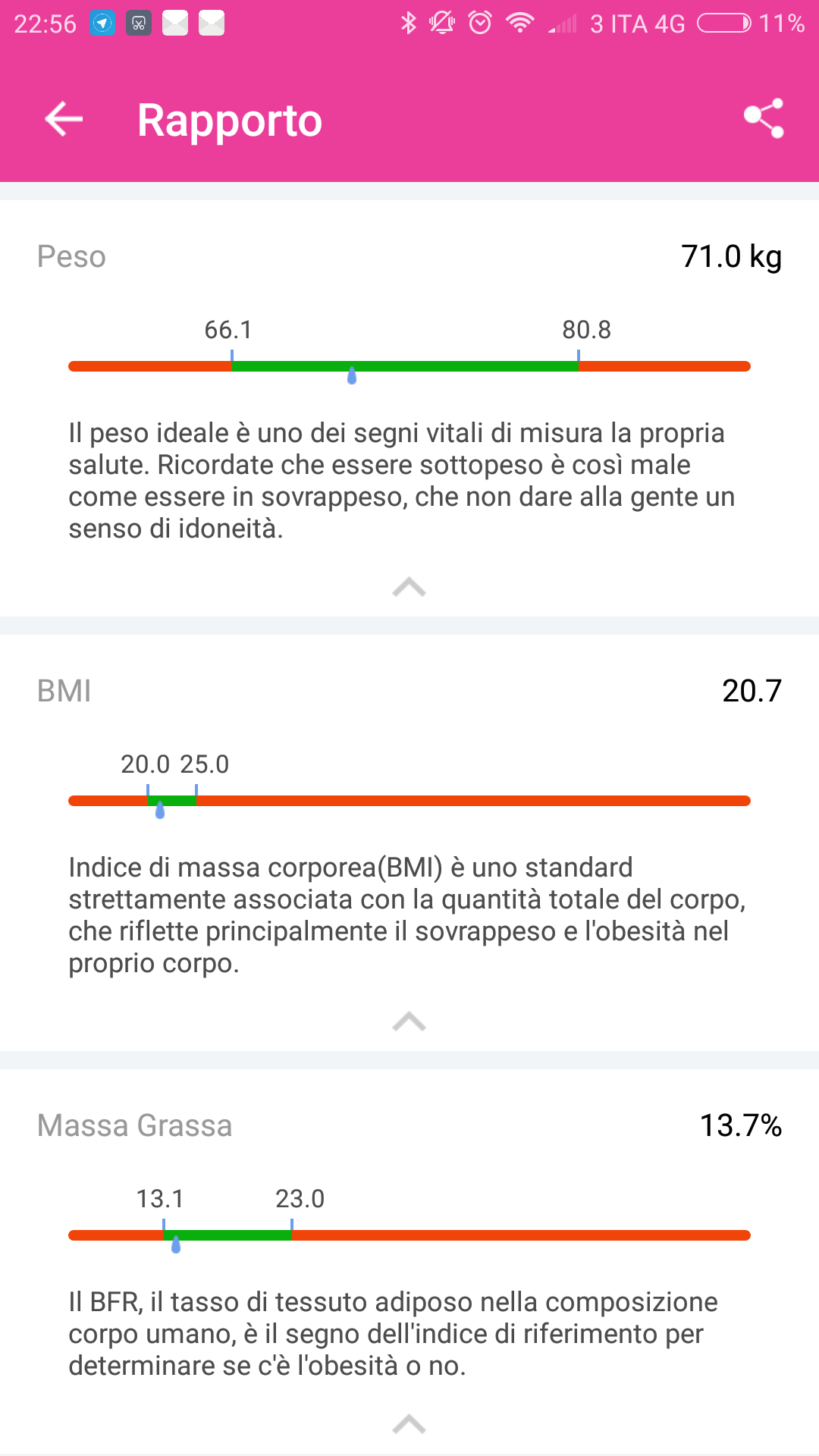 Abbiamo poi, la rilevazione dei vari indici corporei, fra cui il BMI, ovvero l’indice di massa, il BMR, la massa osseamassa viscerale e muscolare, tutti parametri stimati dalla bilancia nel corso delle misurazioni.