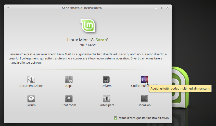 Il secondo metodo è quello di cliccare la voce Codec multimediali presente nella finestra d'avvio di Linux Mint 18.