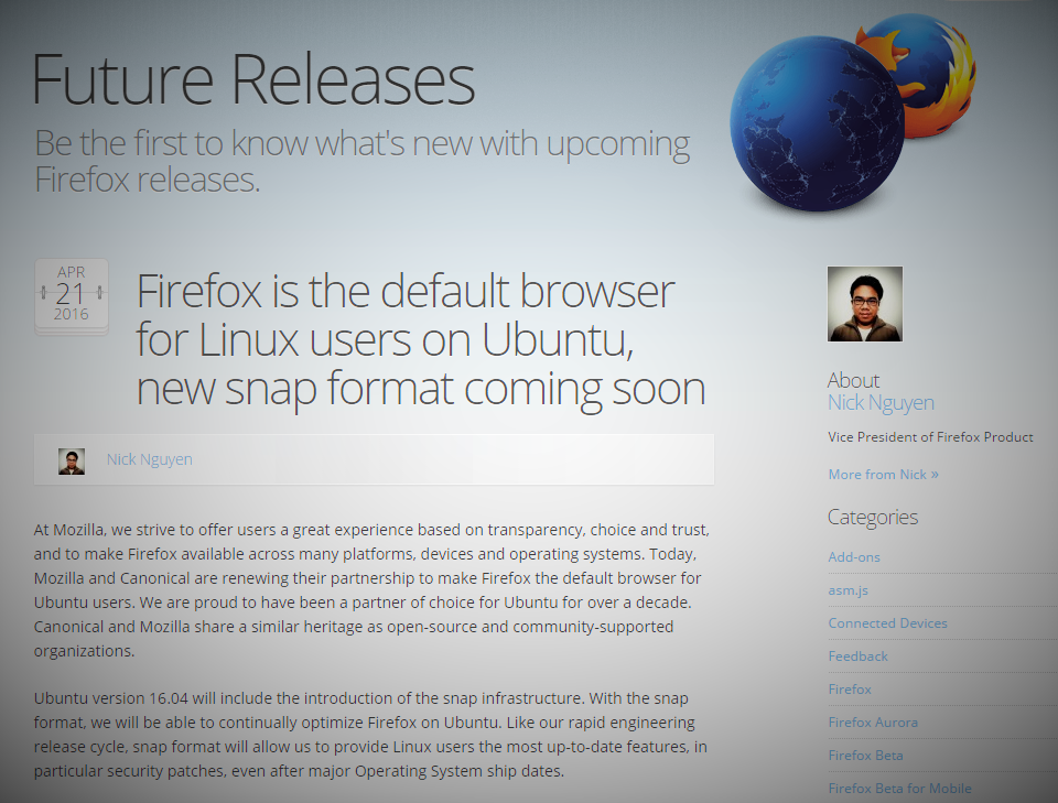 Mozilla ha infatti annunciato, tramite il suo blog ufficiale, che nel corso del 2016 adotterà il formato snap per Firefox.
