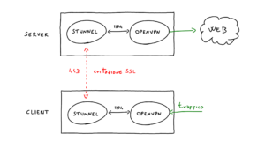Per ottenere questa funzionalità useremo stunnel: un’applicazione che effettua l’incapsulamento dei pacchetti di OpenVPN per fare in modo che sembrino dei normalissimi pacchetti di siti HTTPS. Dovremo installare stunnel sia sul server, per l’occasione un Raspberry Pi, che sul client: li faremo comunicare sulla porta 443 (per nasconderli tra gli altri pacchetti SSL che viaggiano sulla stessa porta) mentre faremo comunicare il client e il server VPN con le rispettive istanze di stunnel sulla porta 1194 (quella di default di OpenVPN).