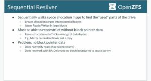 Il processo di ricostruzione degli array degradati in ZFS, funzionava più velocemente dei sistemi RAID tradizionali se e solo se gli array erano quasi vuoti. Questo perché utilizzava un algoritmo che si occupava della sola parte usata del disco, piuttosto che clonare ogni settore sull’intera unità. Il problema è che questo processo richiedeva molti I/O casuali, con conseguenti rallentamenti per array quasi pieni. Il nuovo algoritmo di resilvering sequenziale, invece, permette di ottenere il meglio da entrambi i mondi: accesso in gran parte sequenziale, continuando ad ignorare le parti inutilizzate dei dischi coinvolti.