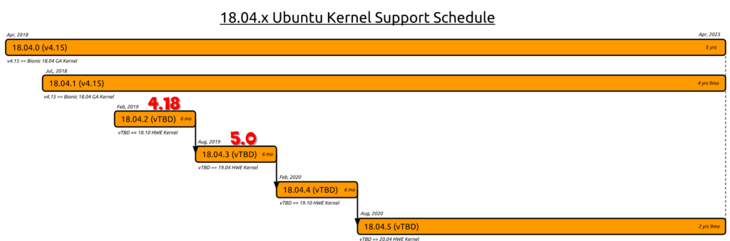 In questo grafico possiamo vedere la pianificazione dei rilasci del kernel; da notare che solo la versione iniziale e finale sono supportate fino al termine della vita di Bionic Beaver mentre quelle intermedie hanno un supporto che dura pochi mesi.