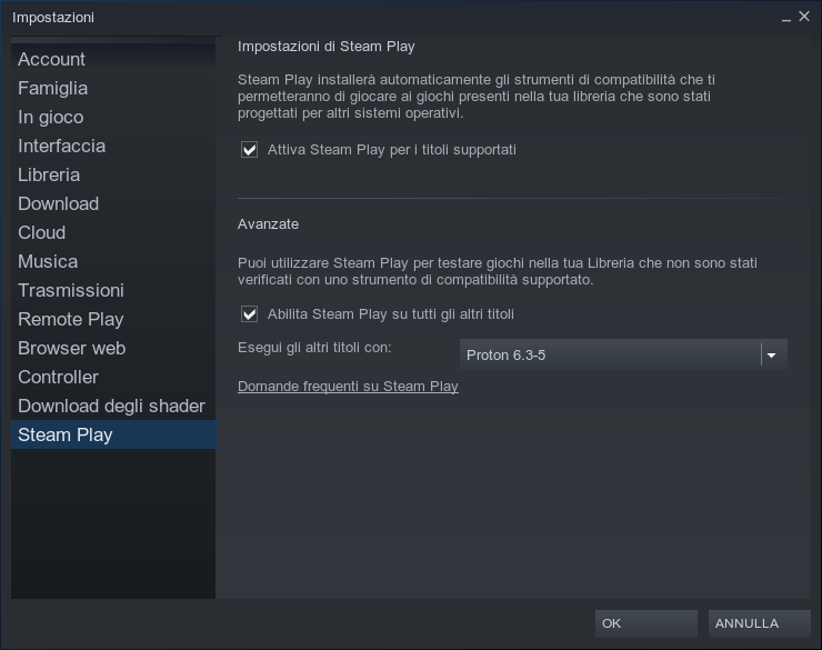 Come abbiamo detto poco fa, Proton è già integrato nel client di Steam. Per attivare Proton ci basterà andare nelle Impostazioni del client Steam, andare alla voce Steam Play e qui spuntare, nelle impostazioni avanzate di Steam Play, la voce "Abilita Steam Play su tutti gli altri titoli". Una volta fatto impostiamo la versione di Proton da utilizzare. Nel mio caso ho impostato l'ultima versione stabile ovvero Proton 6.3-5. Cliccando su Ok ci verrà chiesto di riavviare il client Steam.