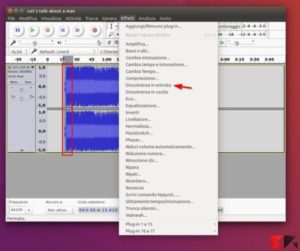 TIP: possiamo anche far sì che il volume si alzi lentamente all’inizio e si abbassi lentamente alla fine del ritaglio. Per farlo selezioniamo una piccola parte all’inizio del brano e clicchiamo su Effetti > Dissolvenza in Entrata e ripetiamo l’operazione con la fine del brano, selezionando però l’effetto Dissolvenza in uscita.